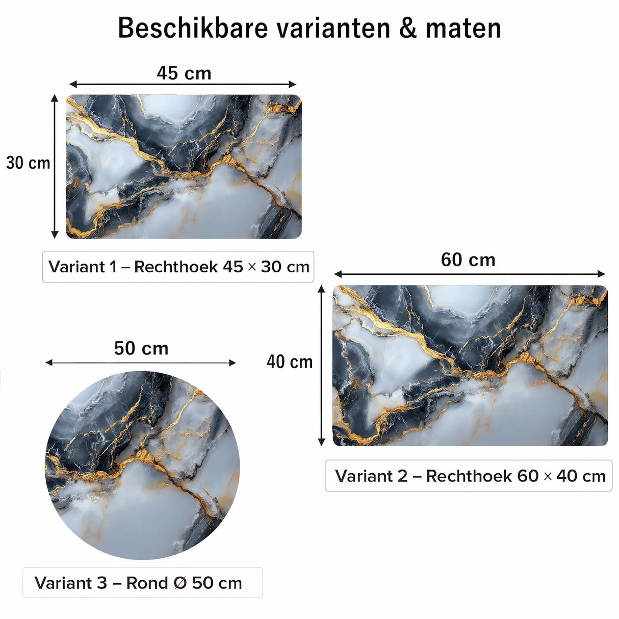 • Formaten: 45×30 cm, 60×40 cm, rond Ø 50 cm